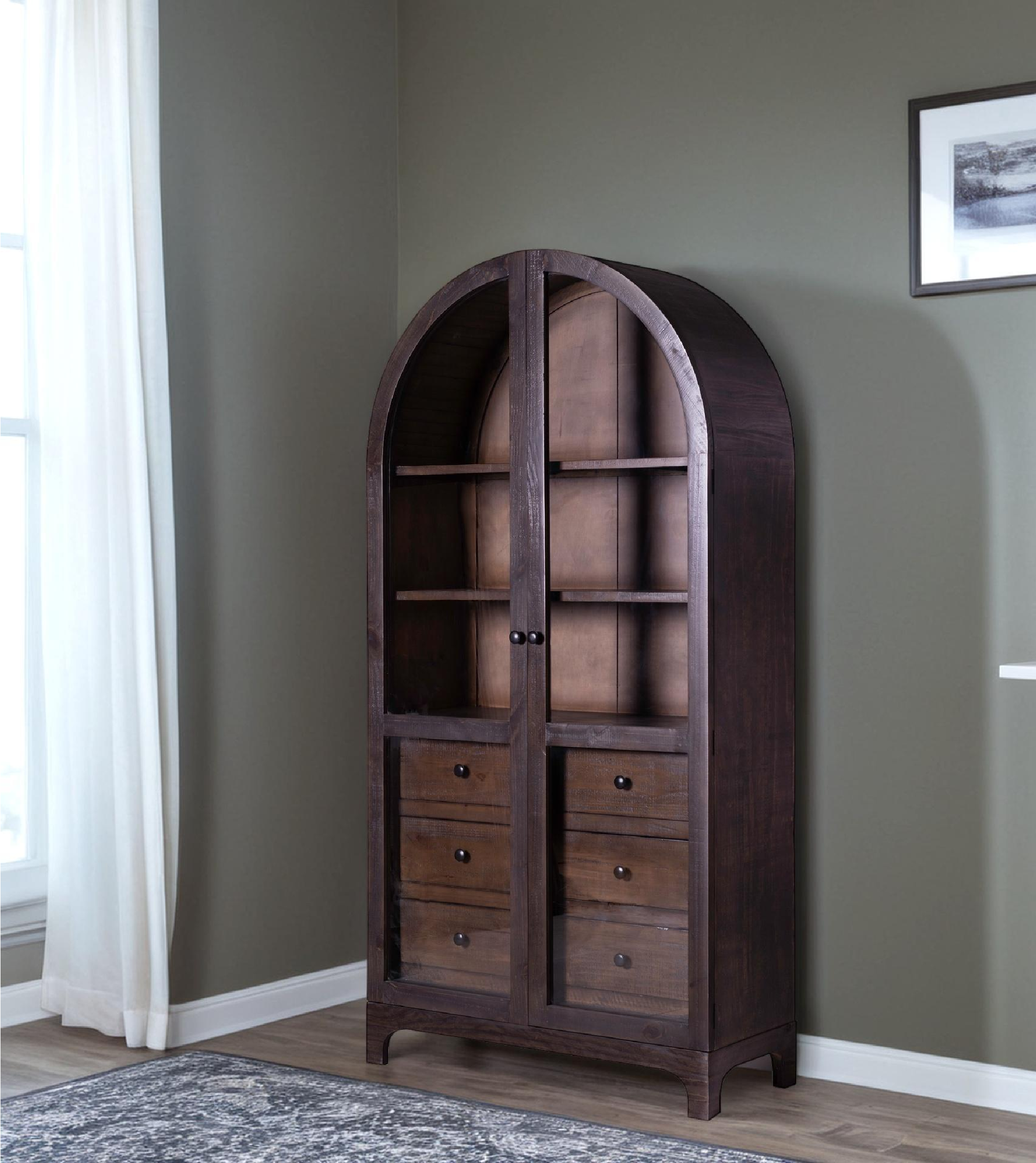 • Design: Features a glass door above and a wood door below, providing a blend of visibility and concealed storage.