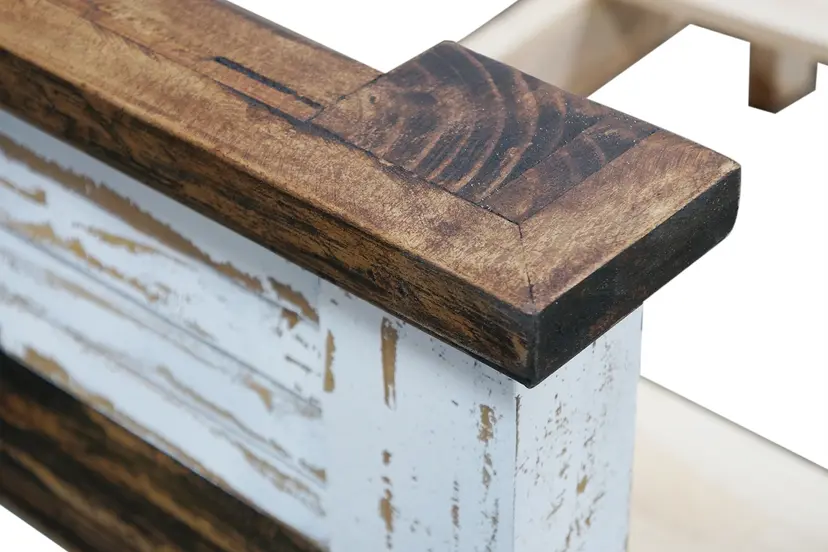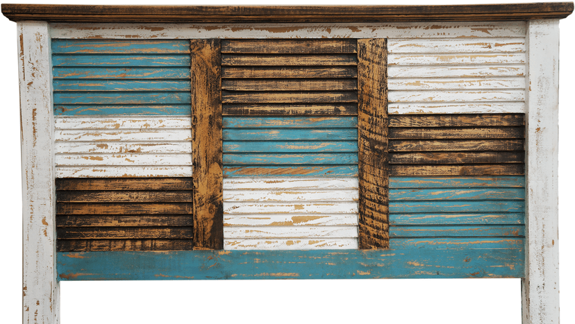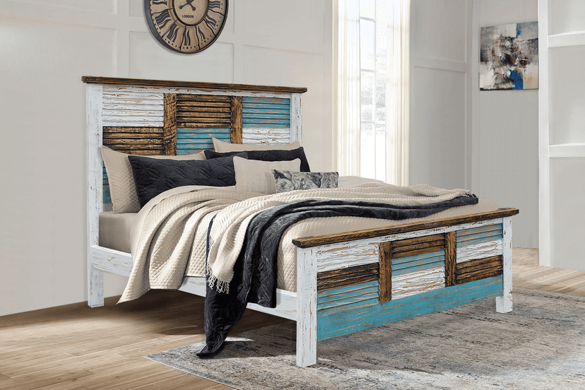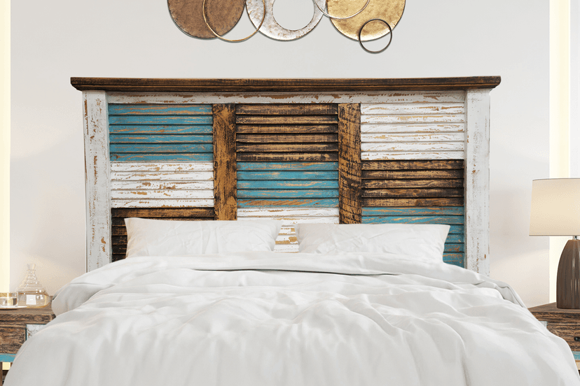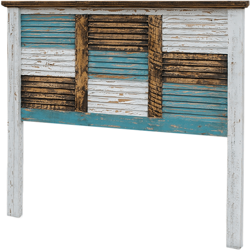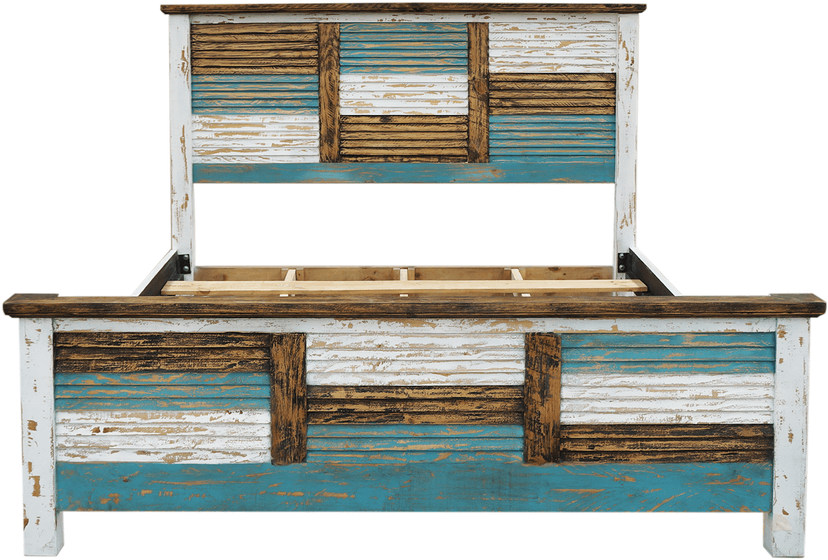 The unique Cabana Bed offers a rustic style with a hint of color. Made from wood in a distressed, multi-finish of brown, white and turquoise hues, this one-of-a-kind bed includes a striking matching headboard & footboard, designed with multi-colored slats.