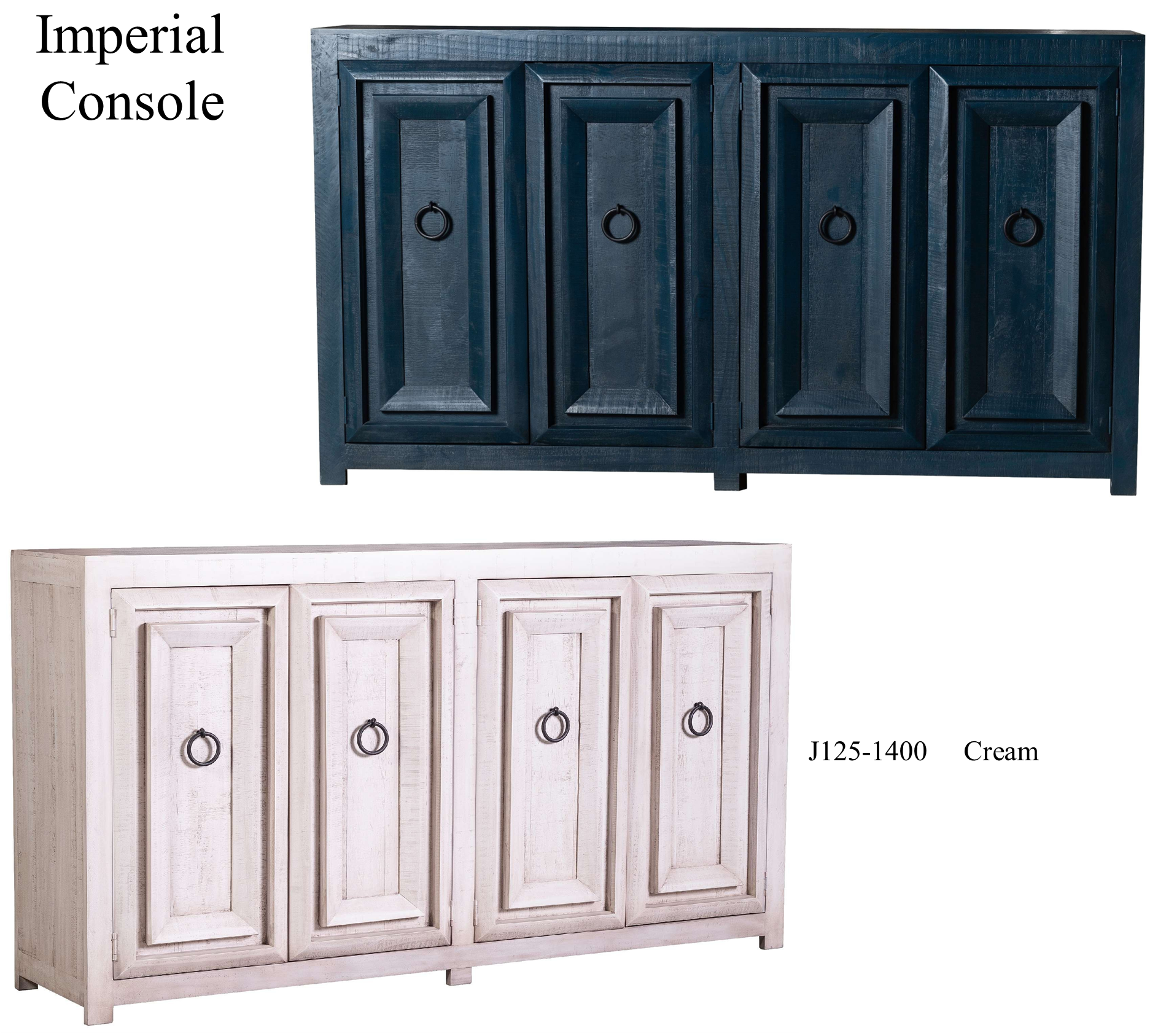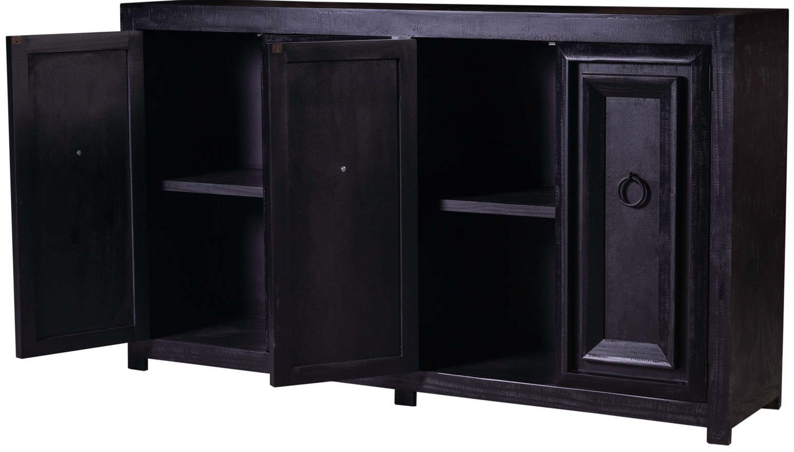 The Imperial Console exudes bold sophistication and striking geometric paneling. Four intricately framed doors, each adorned with a simple black metal ring pull, create a sense of depth and timeless craftsmanship. Its strong lines make it a commanding yet elegant piece, offering both practical storage and a statement of refined style.