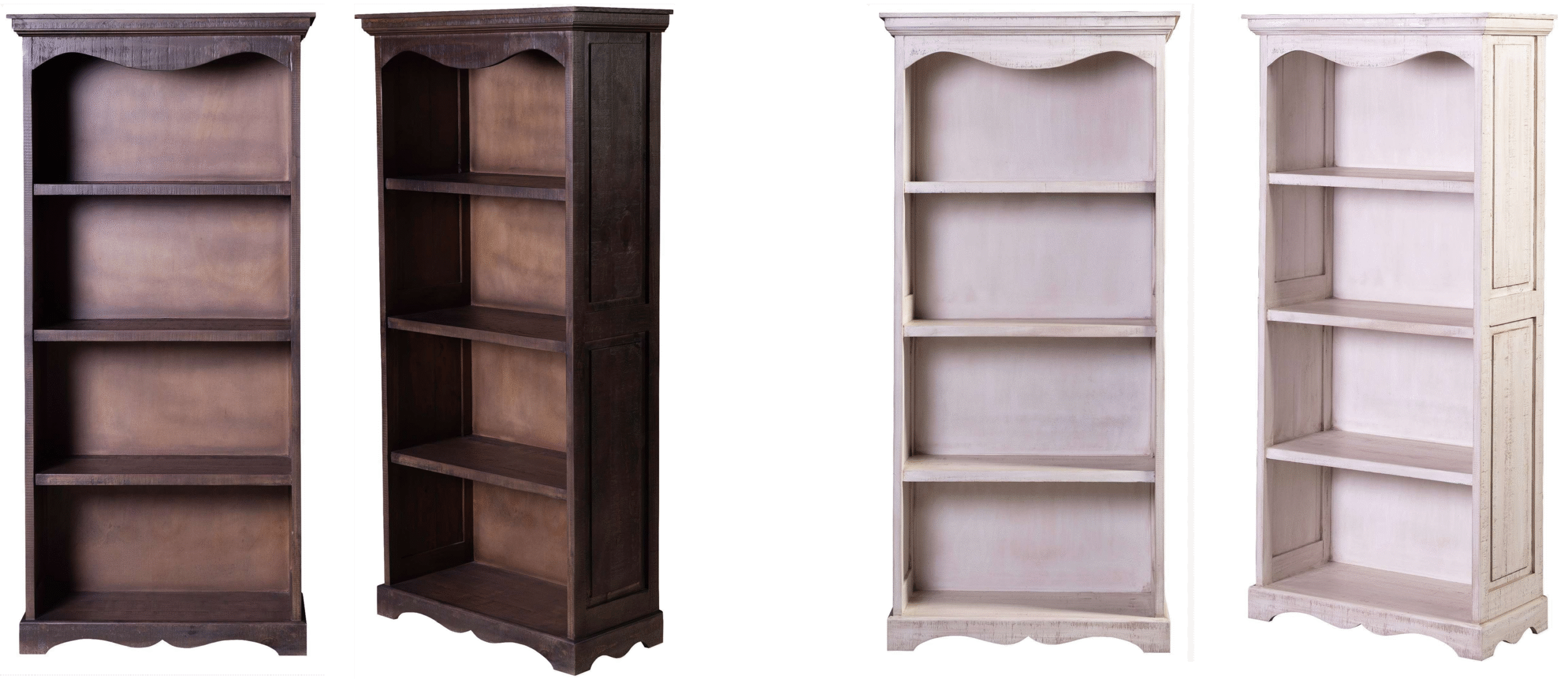 The Laurel Bookcase, standing tall and slender, features four spacious shelves framed within a subtly carved structure, perfect for displaying books, collectibles, or decorative accents. The scalloped detailing along the top and base adds a touch of softness and romantic character, while the paneled sides highlight its classic craftsmanship. Its look enhances the sense of timelessness, making it an inviting piece that blends effortlessly into farmhouse, cottage, or shabby chic interiors.