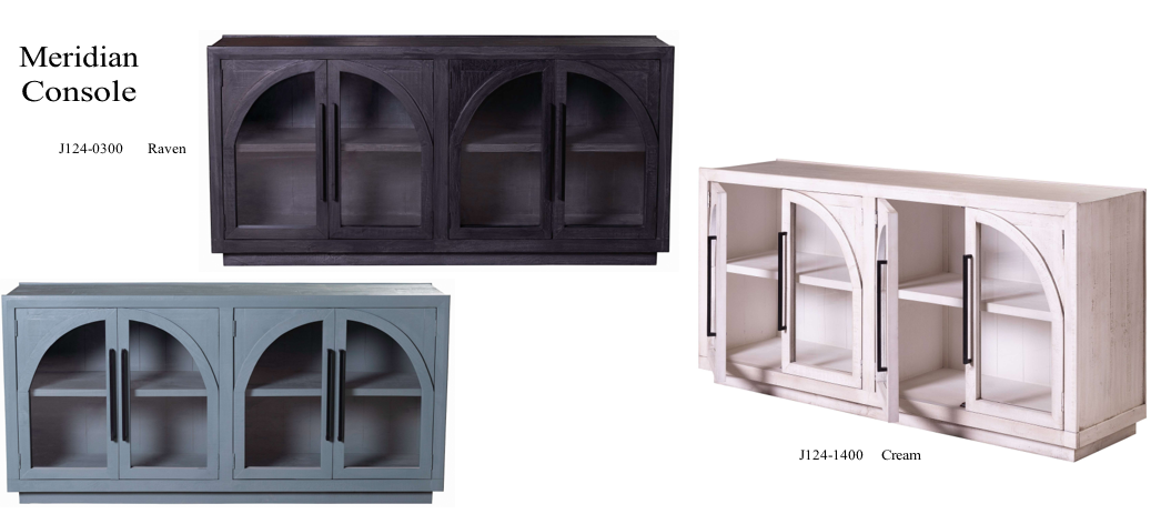 The Meridian Console embodies a modern yet timeless elegance. The defining feature lies in its four glass-front doors, each framed with bold arch detailing that adds depth and a sense of symmetry. Sleek black metal handles run vertically along the center, providing a contemporary contrast to the subdued finish. Its streamlined silhouette allows it to sit gracefully in a living room, dining area, or hallway, while the arched motifs bring an element of architectural artistry. It feels equally suited to a modern farmhouse, an industrial loft, or a transitional home that blends classic and contemporary