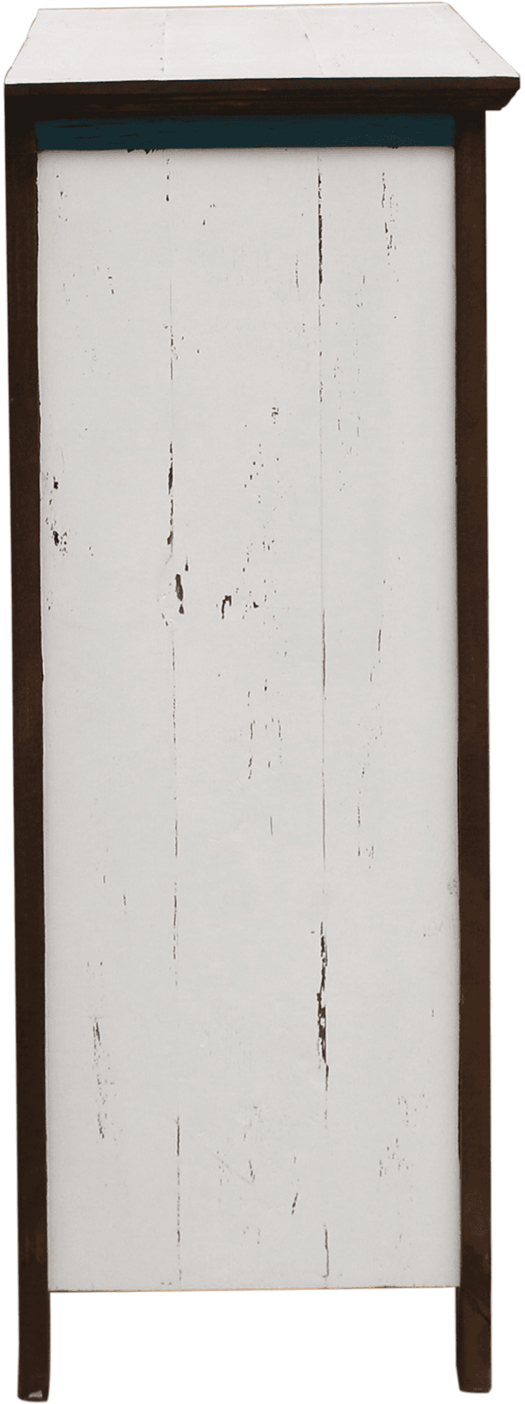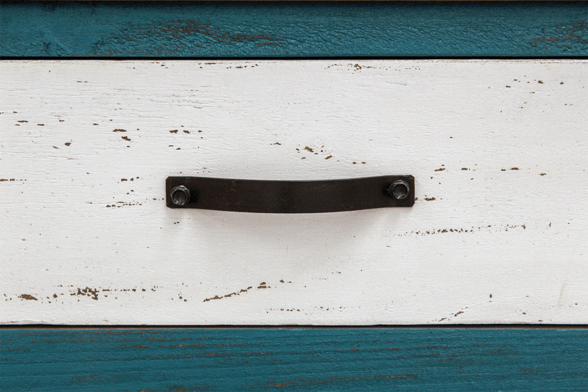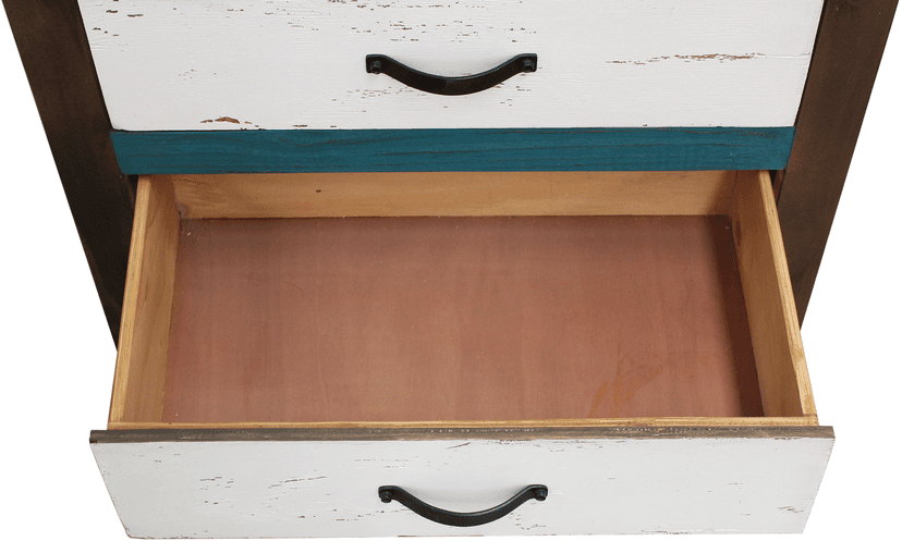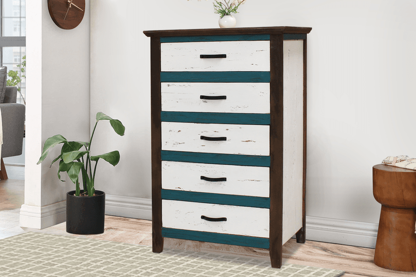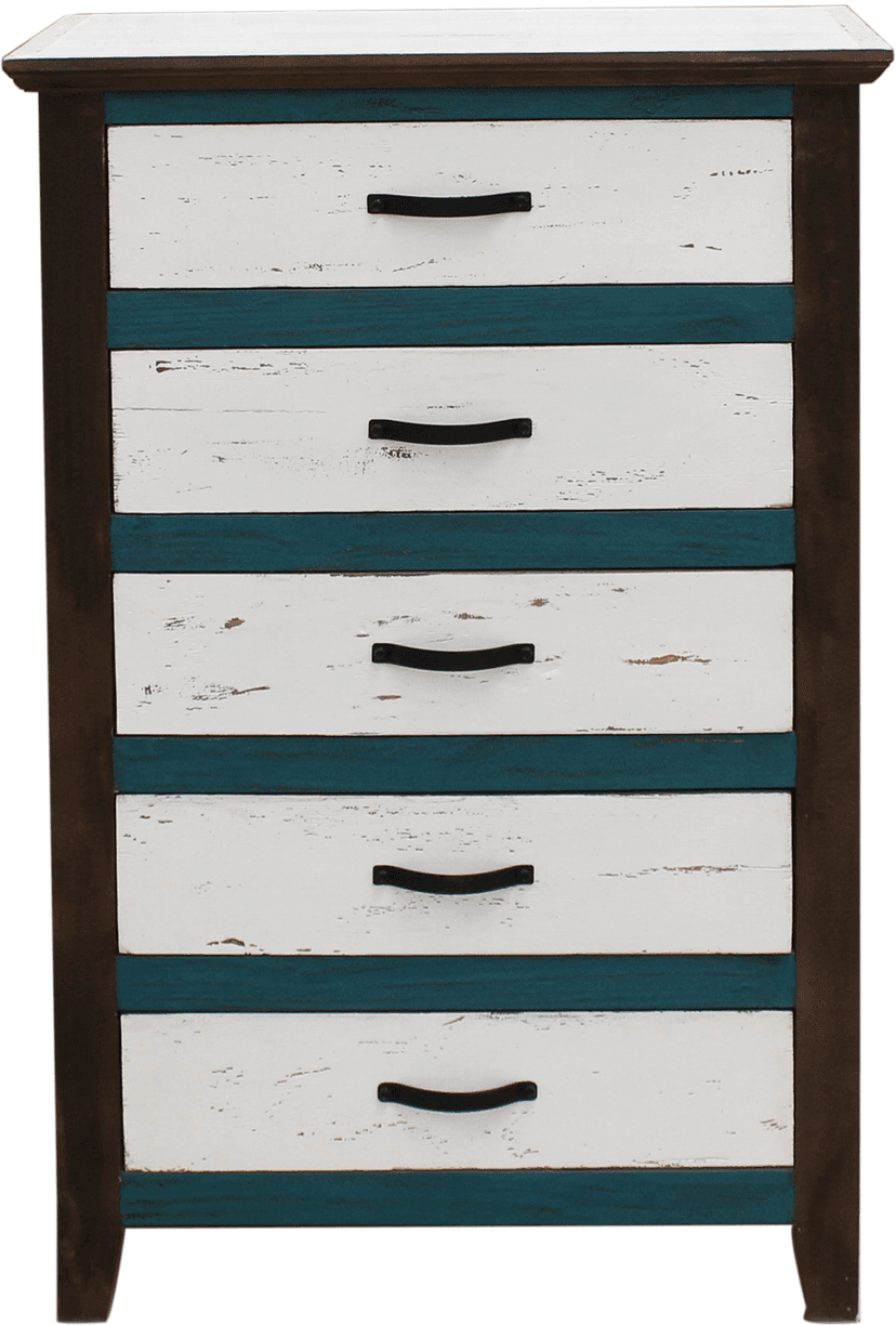 Beautifully hand-crafted, Pete’s Cabana Chest has a unique rustic style, adding a hint of color to any room. This chest is finished in a multi-tone with white drawer fronts, side panels and top. Brown and turquoise accents make this chest truly unique in design. Five storage drawers are constructed with high-quality ball-bearing glides for years of easy use.