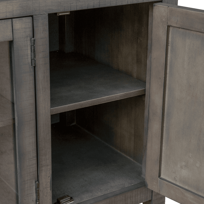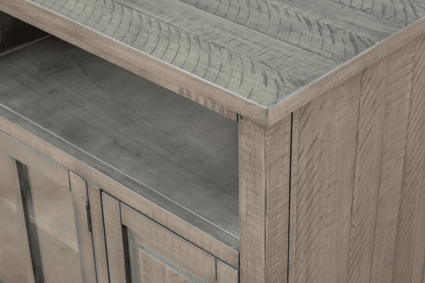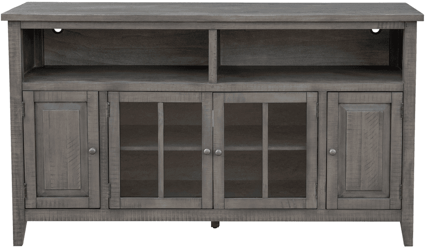 Perfect for your TV and media storage, the Rustic Ranch 60″ Media Console is available in four distressed finishes offering a contemporary yet rustic look. On top is room for your TV with two open spaces below for media components. Wires are easily managed through convenient holes in the back. Adding to its unique look of planked construction, two central doors with glass panes, flanked by two wood doors with raised panels, provide one shelf behind each, for ample storage room. Quality-built from solid wood, then distressed in either Antique Ash, Vintage White, Allspice Brown or Vintage Black, the Rustic Ranch 60″ Media Console is versatile in style while providing functionality to any living space.